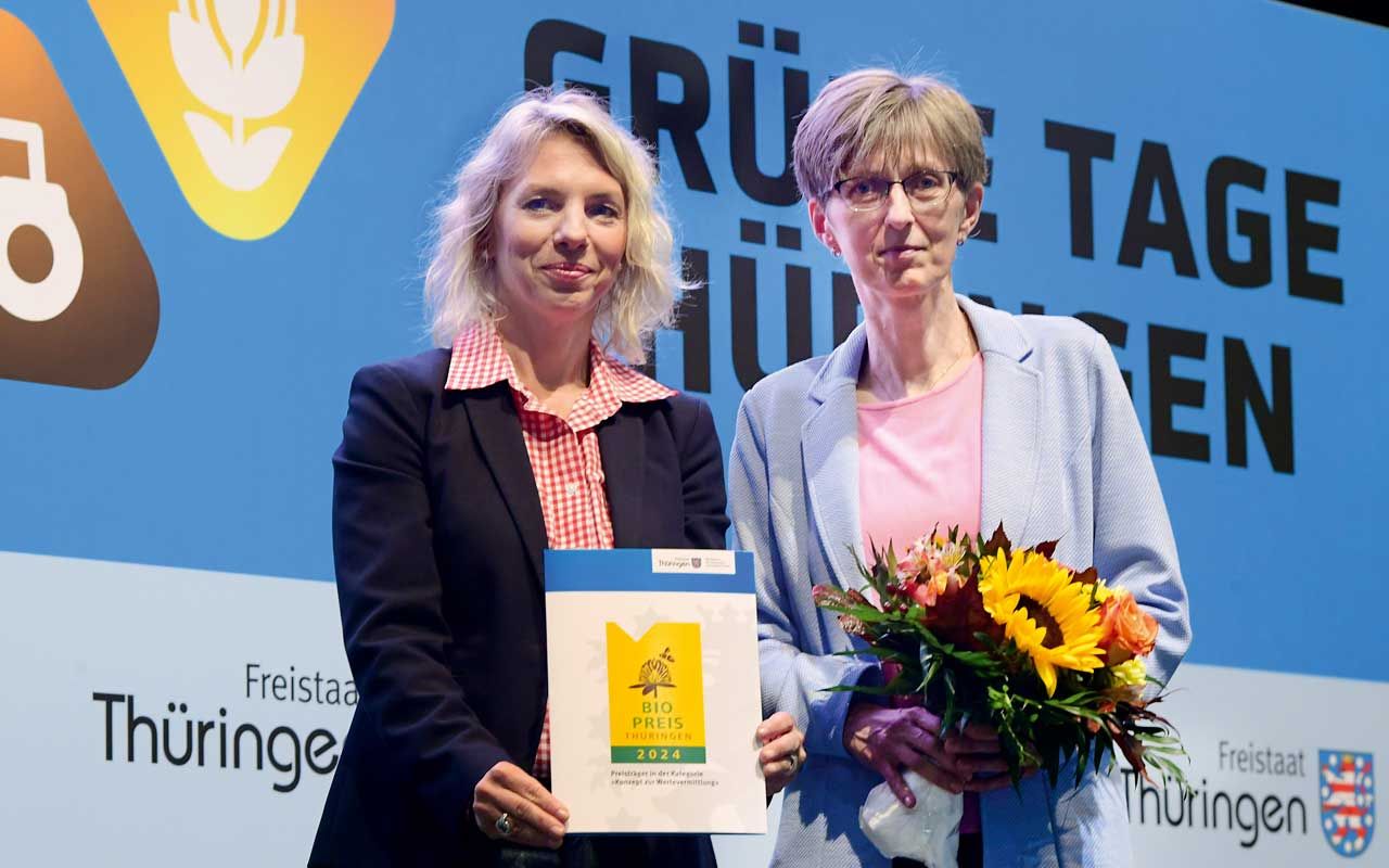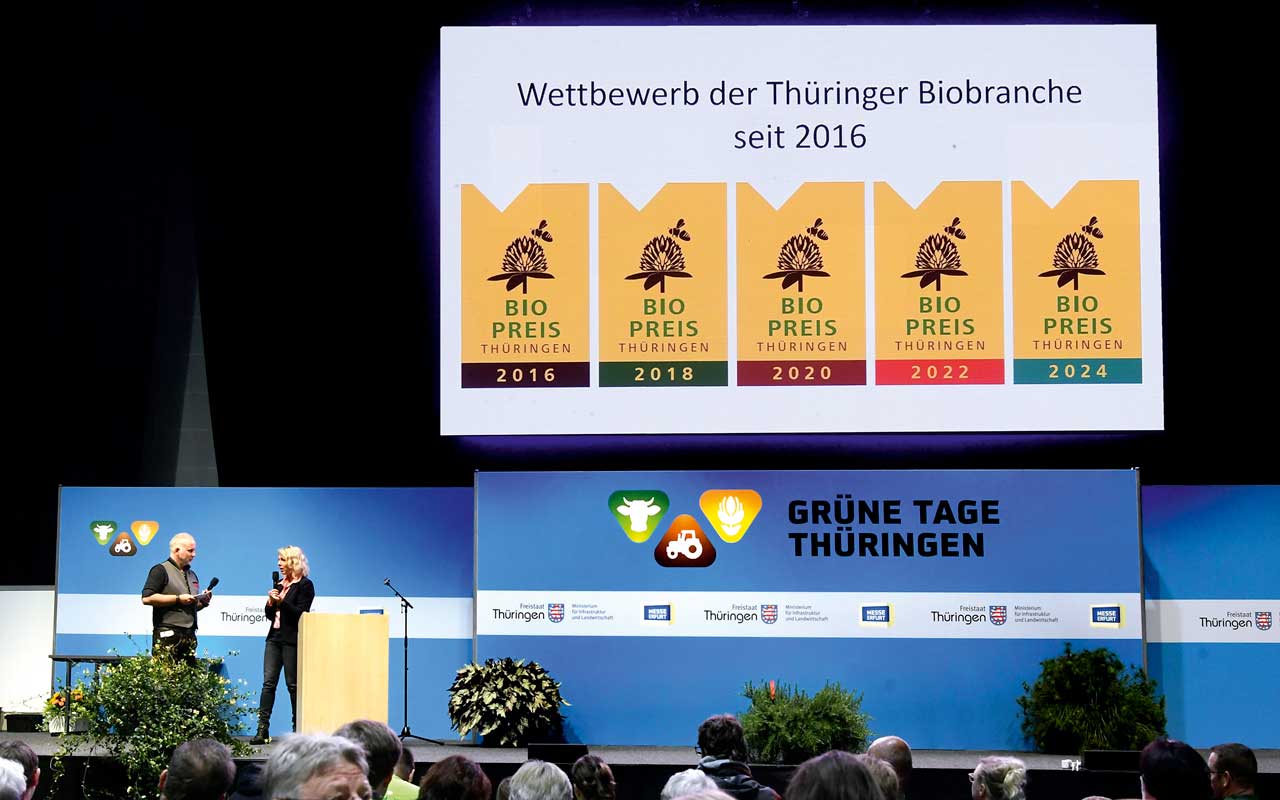 Die Verleihung des Wettbewerbes „Bio-Preis Thüringen“ war eines der Highlights bei der Fachmesse „Grüne Tage Thüringen“. Am 28. September 2024 zeichnete die Thüringer Ministerin für Infrastruktur und Landwirtschaft, Susanna Karawanskij, die insgesamt sechs Preisträger in zwei Kategorien aus und vergab zusätzlich eine Anerkennung.