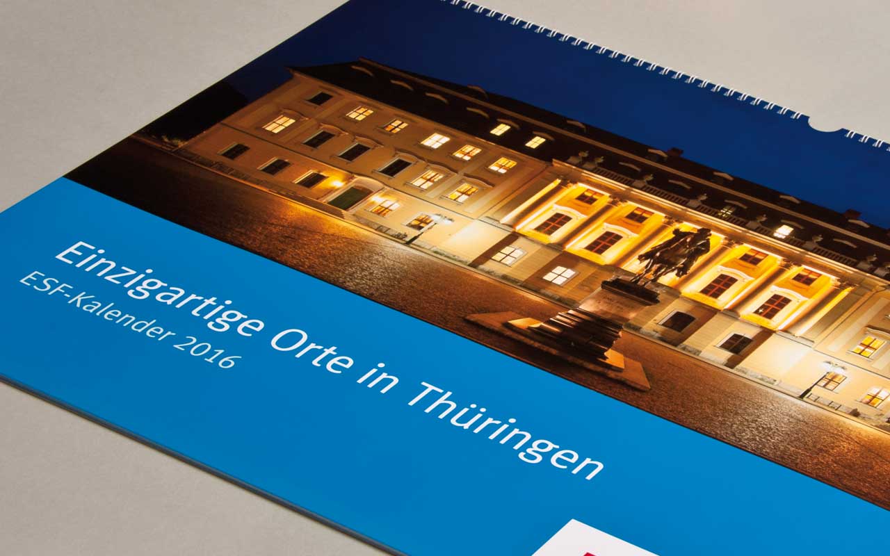 Der Kalender im Format DIN A2 zeigt bekannte und weniger bekannte Superlative des Freistaats wie die erste Orchesterschule Deutschlands, die einzige bebaute Brücke nördlich der Alpen oder die älteste Synagoge in Europa. Zu den weniger bekannten Orten dürfte beispielsweise eine der ältesten Tanzlinden in Deutschland gehören, zumal der Brauch, in einer Linde einen Tanzboden einzubauen und darauf zu musizieren sowie zu tanzen, vorrangig im fränkischen Raum gepflegt wird. Auch die Tatsache, dass der höchste Fachwerkturm Europas auf dem Possen bei Sondershausen zu finden ist, dürfte weniger bekannt sein. Insgesamt zeigt der ESF-Kalender 13 besondere Orte in Thüringen.