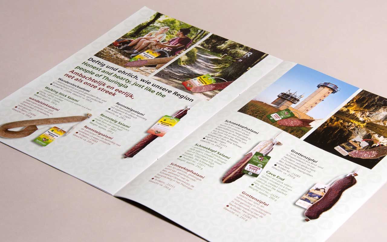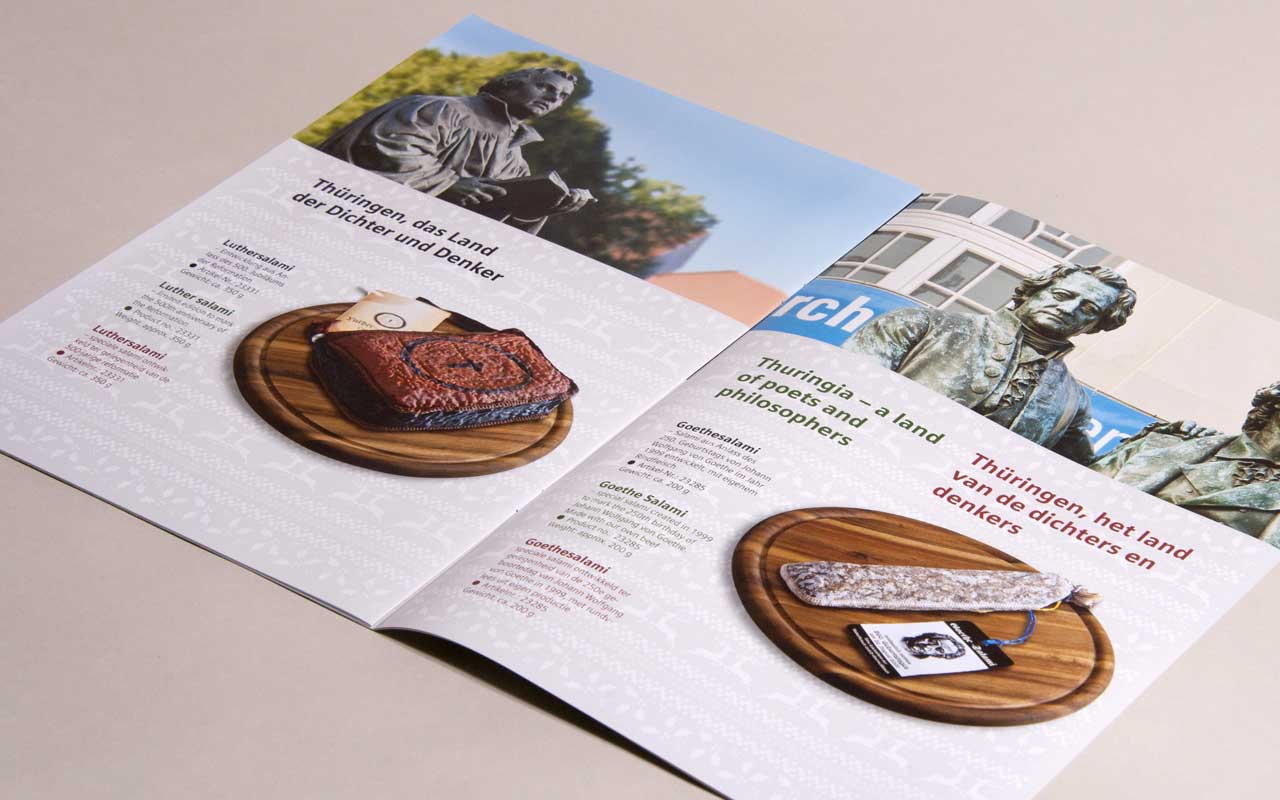 Der würzige Duft frisch geräucherter Wurstwaren scheint dem Betrachter unwillkürlich in die Nase zu steigen, angesichts dieser vielen leckeren Wurstsorten. Manche Würste tragen den Namen von historischen Persönlichkeiten, wie von Martin Luther oder Wolfgang von Goethe. Andere sind nach Südthüringer Wanderzielen benannt, wie nach dem Rennsteig, dem Schneekopf oder den Saalfelder Feengrotten. Die Produkte des Kataloges können als geschmackvolles Präsent weitergegeben werden. Jede Wurst hat seinen speziellen Geschmack wie seinen besonderen Charakter.