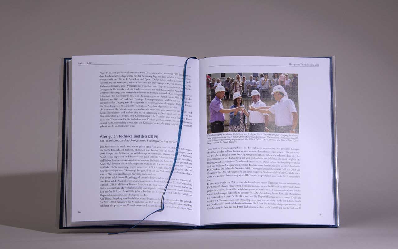 So erstellten wir für das IAB in Weimar bereits den zweiten Band für das Jubiläum 2022. Neben der Schilderung der Standortentwicklung wurden auch Kuriositäten erzählt und es wurde über die Teilhabe am gesellschaftlichen Leben berichtet. Warum beispielsweise ein Institut der Bauforschung eine Hightech-Falle für Geparde entwickelte oder wie in Weimar ein Betriebskindergarten entstand.